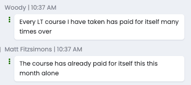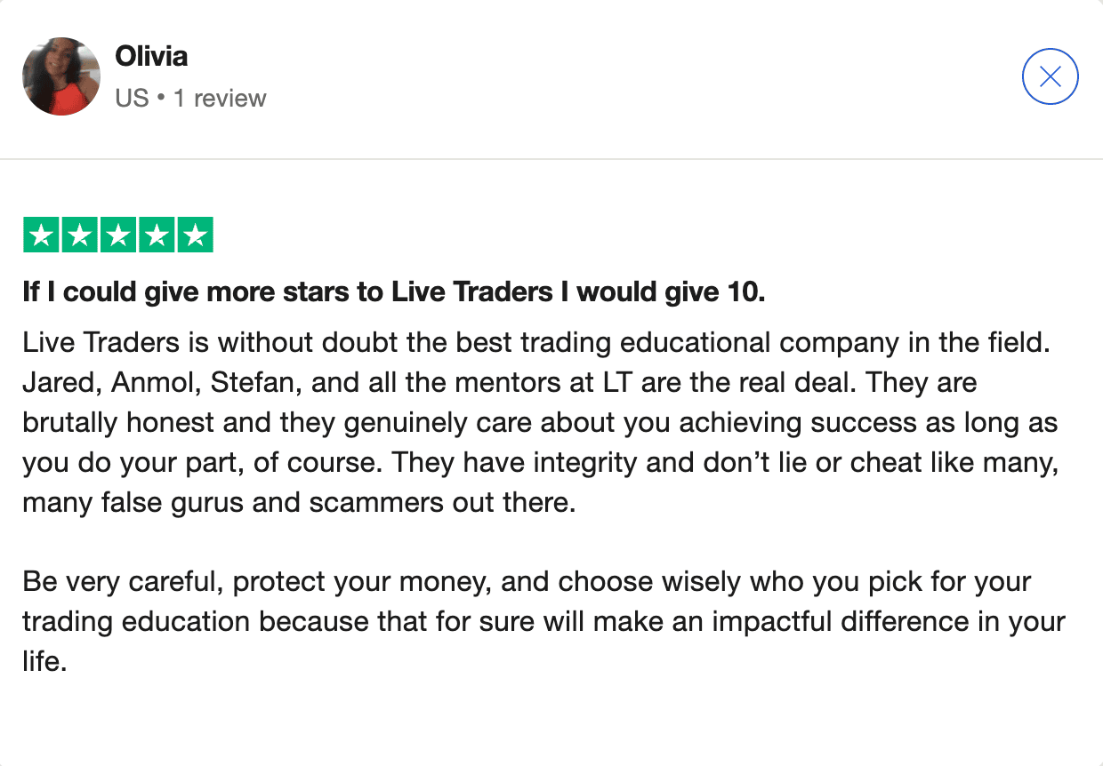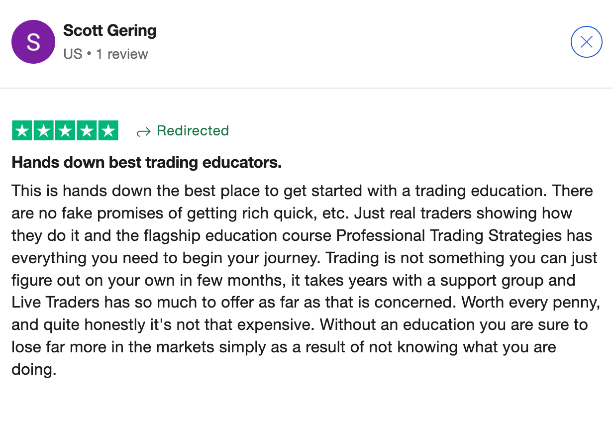 "After spending thousands upon thousands of dollars on educational platforms I was left frustrated and overwhelmed ... My first year with these guys I did $68,000 in registered trading profits. The education is beyond the most important factor to this game. Plus having access to a chat room where you have tons of like minded individuals all pushing for the same goal is also another crucial component to my success."